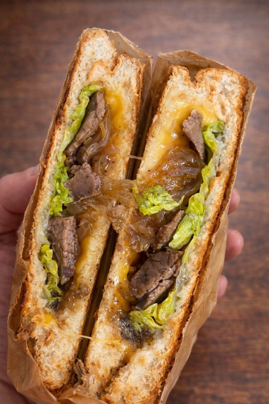 pain de mie toasté, laitue, oignon confit, poitrine de bœuf, cheddar maturé