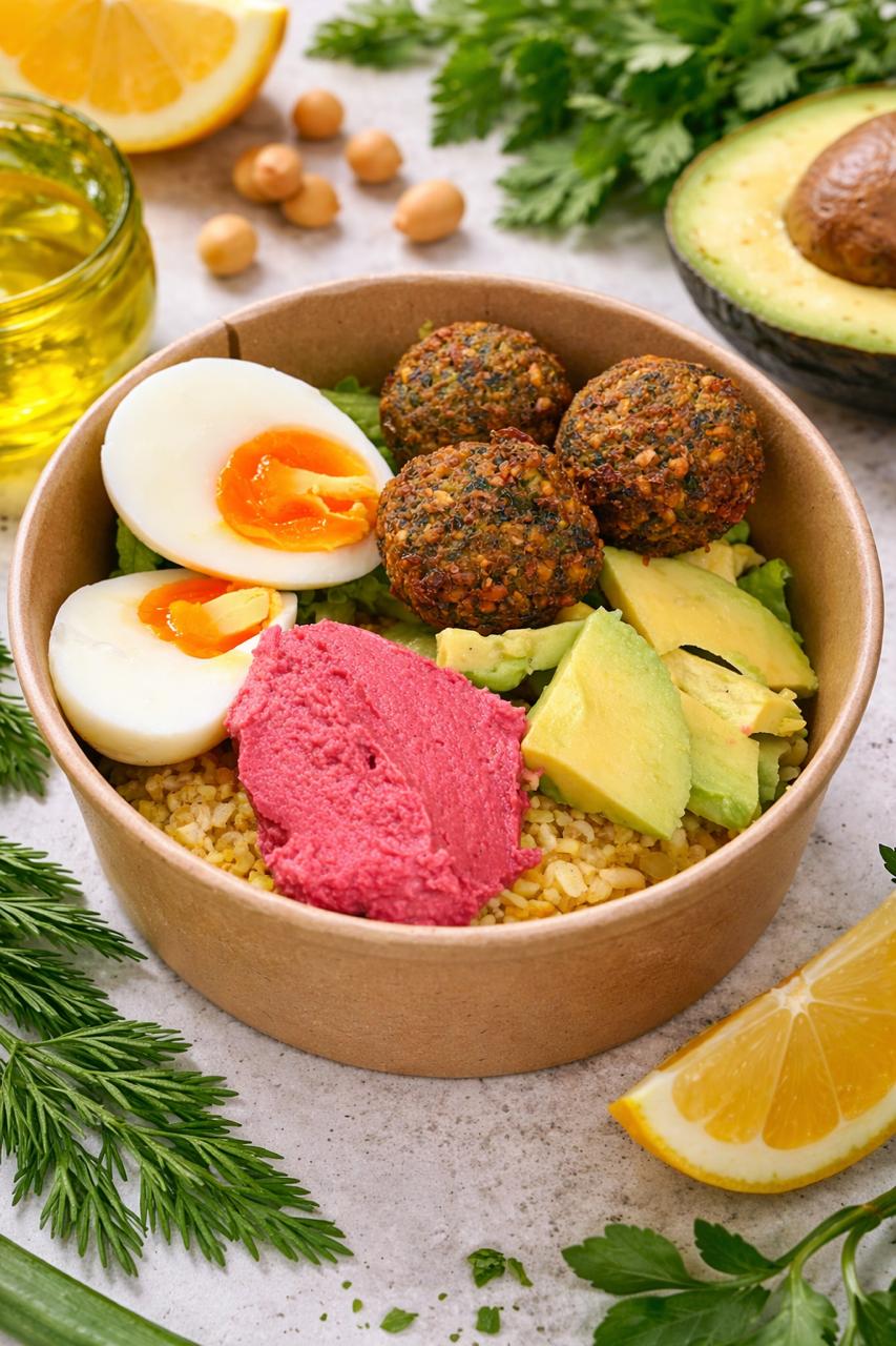 Boulgour, batavia, falafels aux herbes, houmous betterave, avocat, œuf (servi froid)